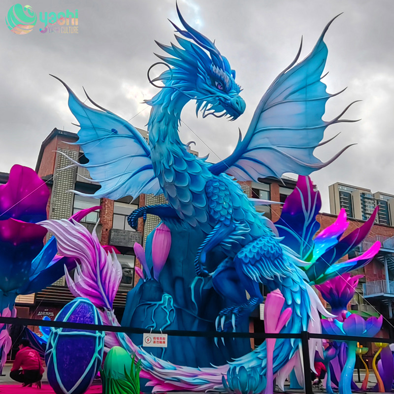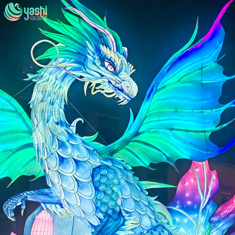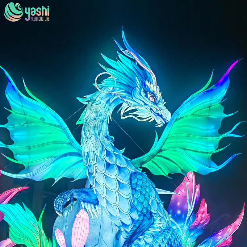 This azure dragon lantern features intricate scale detailing, vibrant teal-blue gradients, and glowing LED accents. With majestic wings and a fierce expression, it’s crafted from durable materials, emitting a stunning nighttime glow. Ideal for cultural festivals, theme parks, art exhibitions, or luxury events. Appeals to fans of mythical art and event planners, creating an immersive, photogenic atmosphere. Easy to install, perfect for commercial decor and celebrations blending Eastern mythology with luminous design.