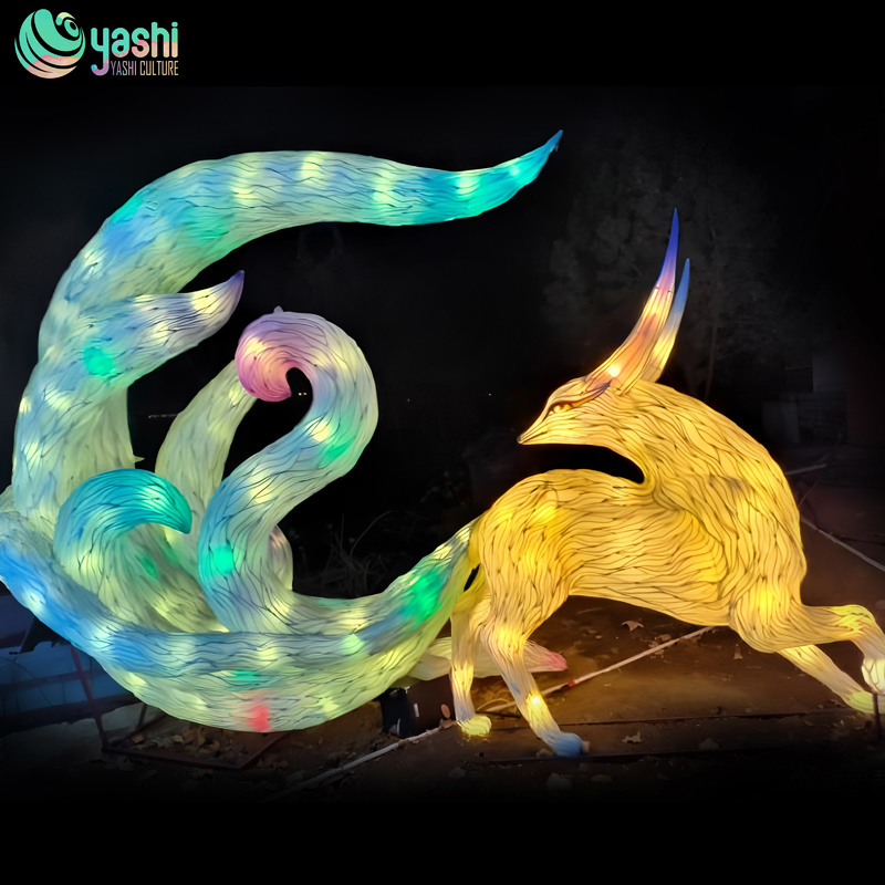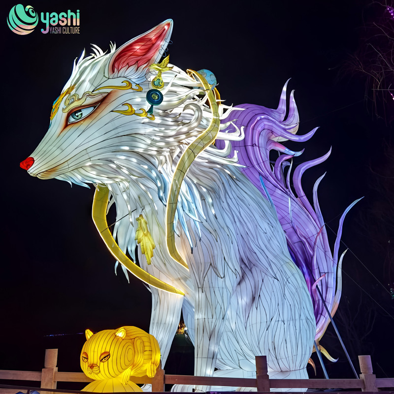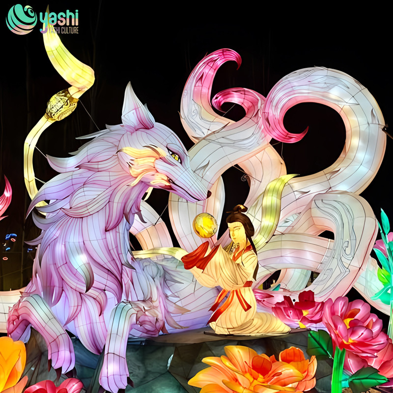 This mythical fox lantern features a white-pink gradient design, intricate floral patterns on its face, and flowing, luminous details. Crafted from durable materials with embedded LED lights, it emits a magical glow at dusk and night. Perfect for cultural festivals, theme parks, art exhibitions, or fantasy events. Appeals to fans of mythical creatures and event planners, creating an immersive, photogenic atmosphere. Easy to install, ideal for commercial decor and celebrations that blend Eastern mythology with luminous art, drawing crowds with its enchanting and detailed design.