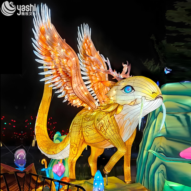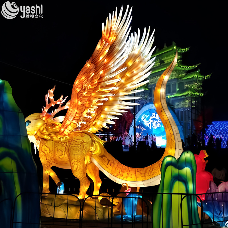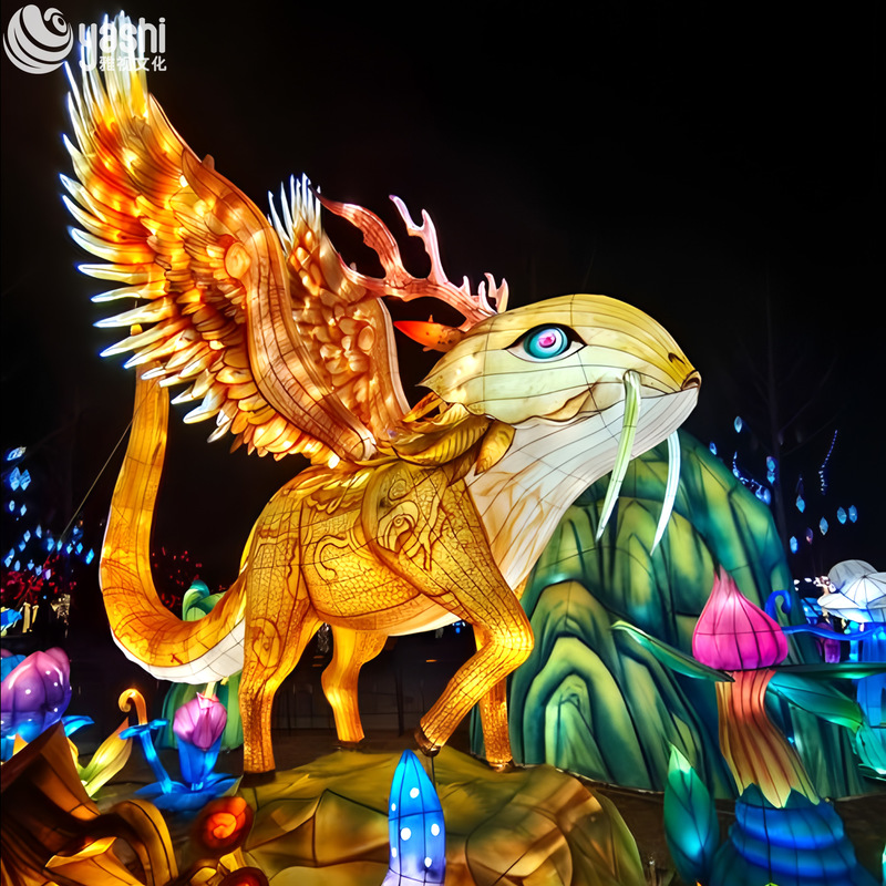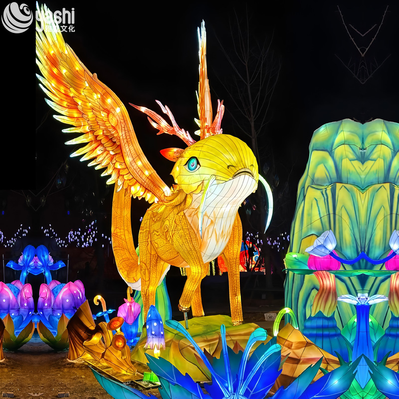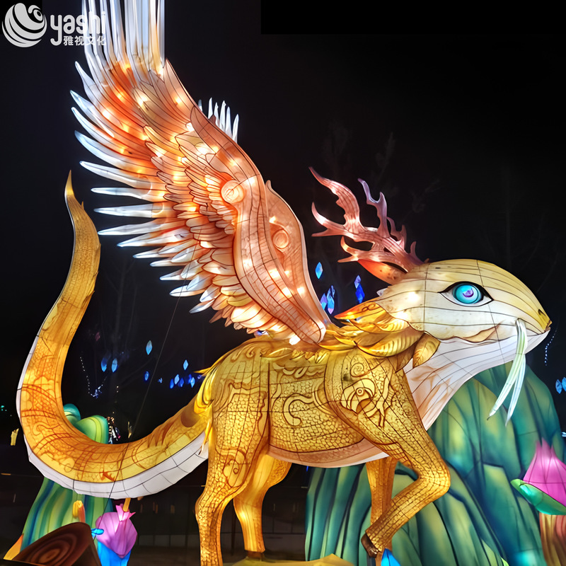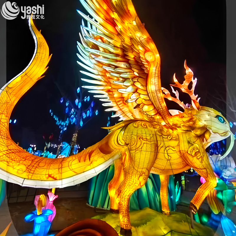 This mythical beast lantern features golden scales, intricate patterns, large luminous wings, and a unique hybrid design. Crafted from durable materials with embedded LED lights, it emits a majestic glow at night.