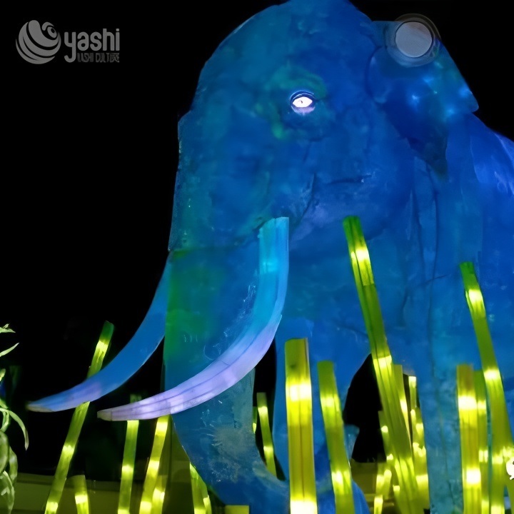 This striking neon blue elephant lantern features a mesmerizing blue-purple gradient design, intricate textural details, and glowing tusk and eye accents. Surrounded by illuminated bamboo-like elements, it’s crafted from durable materials with embedded LED lights for a captivating nighttime glow.