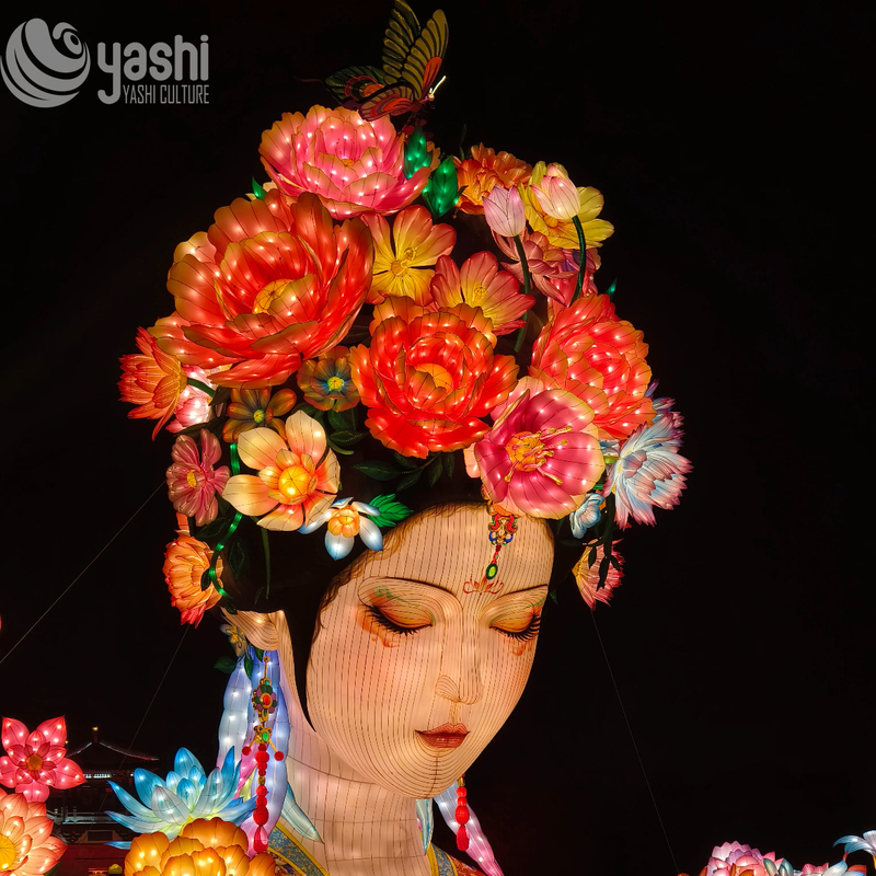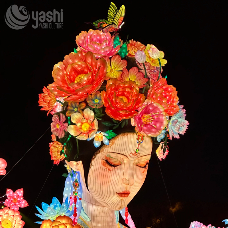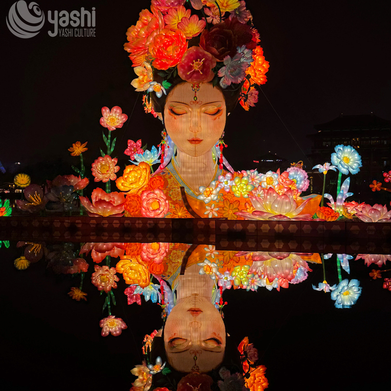 This is a breathtaking lantern installation inspired by ancient Chinese court ladies, a fusion of art and tradition. The figure, adorned with a profusion of vibrant floral headdresses and elegant attire, is mirrored perfectly on the water, creating a surreal visual symphony. Crafted with meticulous handiwork, it radiates a warm, enchanting glow, ideal for cultural festivals, scenic spots, and waterfront venues. It not only serves as a stunning focal point that blends historical charm with artistic innovation but also delivers an immersive experience, making it a must-have attraction for venues aiming to captivate audiences and infuse spaces with profound cultural elegance and visual magic.