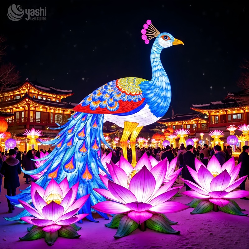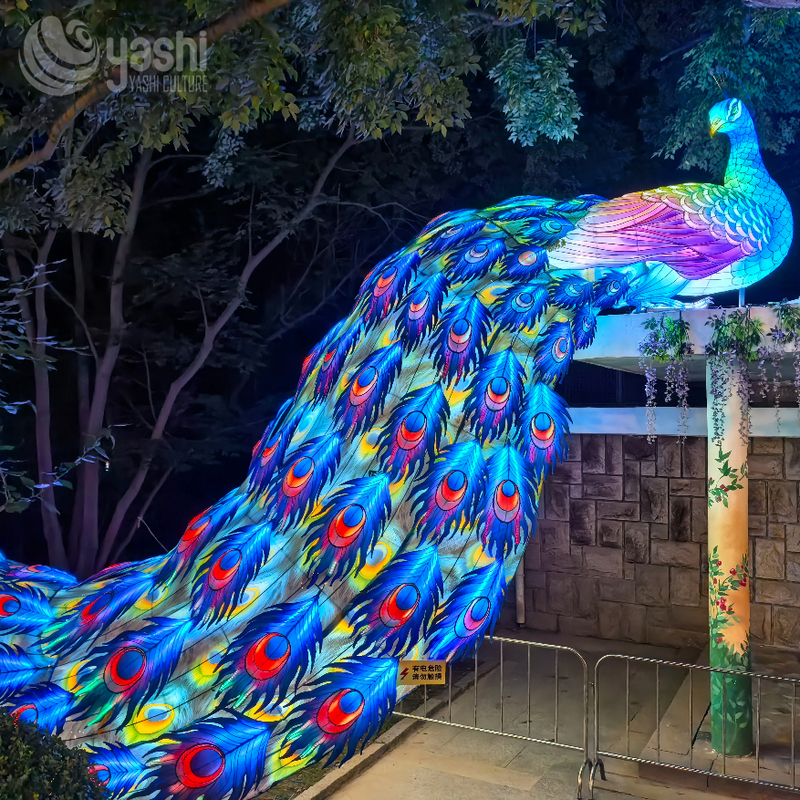 This is a stunning peacock-themed lantern artwork, a perfect blend of art and light. With its extremely long, colorful tail feathers featuring vivid patterns, and a lifelike body, it’s handcrafted with exquisite details. When lit, it emits a brilliant glow, ideal for outdoor festivals, theme parks, and commercial spaces. It not only adds a touch of exotic charm but also creates a captivating visual feast, making it a standout decoration for any event.