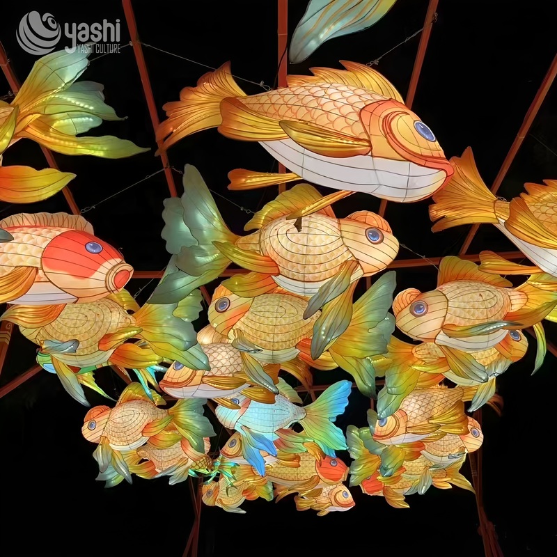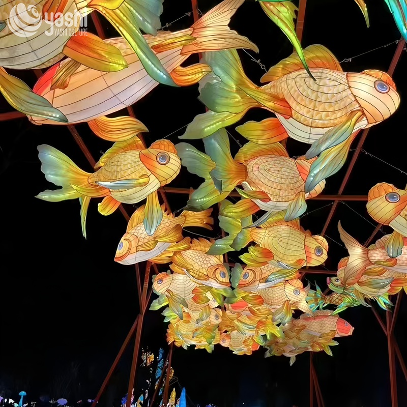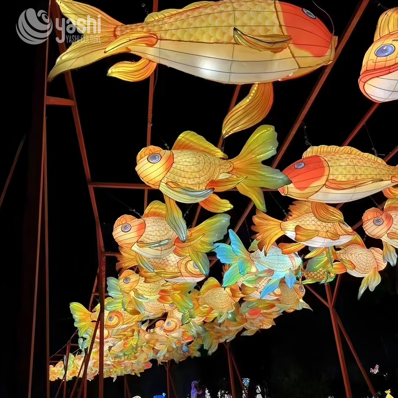 This Fish - Themed Lantern Installation is a vibrant and lively attraction for outdoor scenic spots, festivals, and commercial areas. It features a school of exquisitely crafted fish lanterns in warm gold, orange, and colorful hues, each equipped with LED lights that bring them to life at night, creating a dynamic and immersive underwater - like scene.
