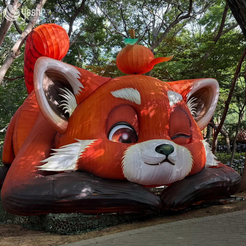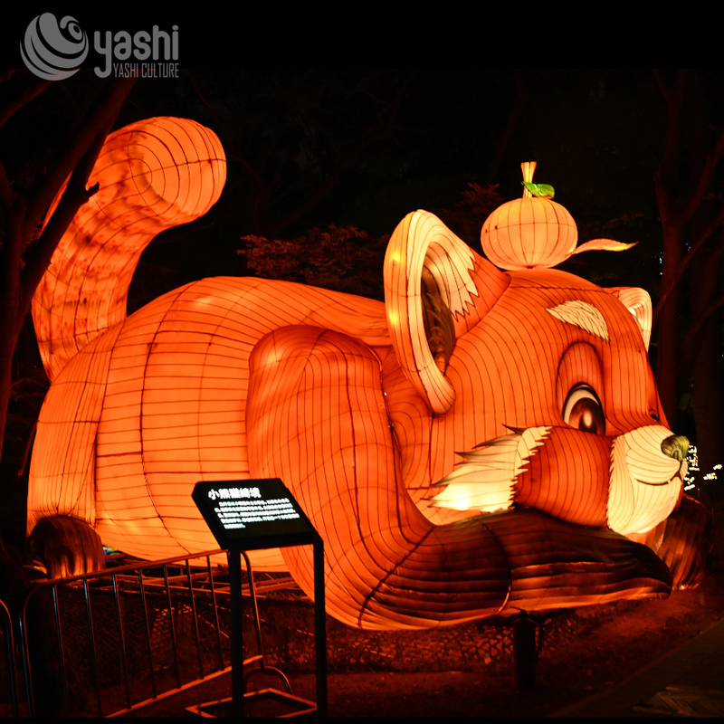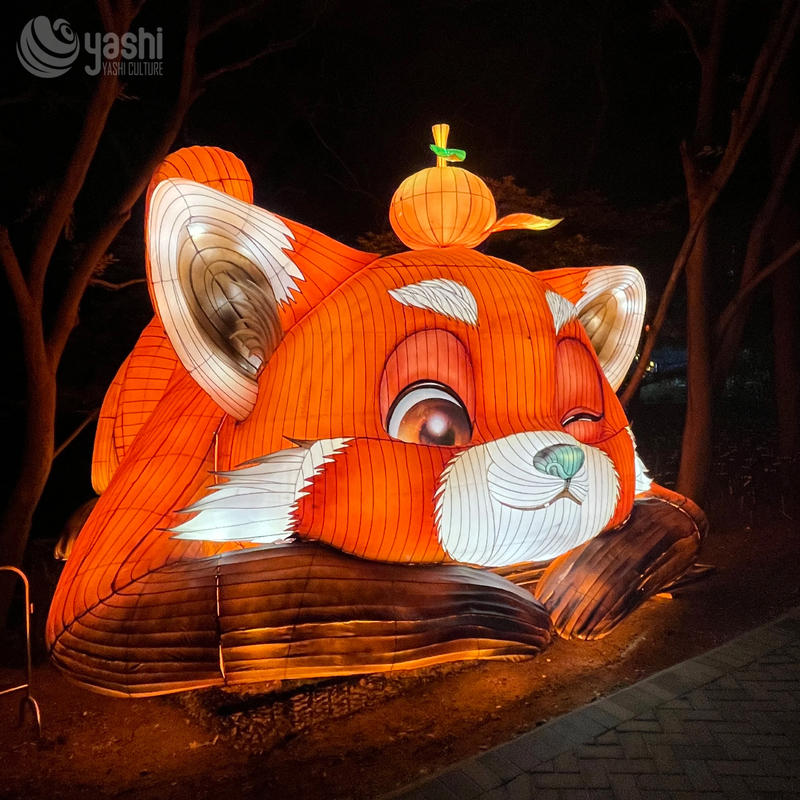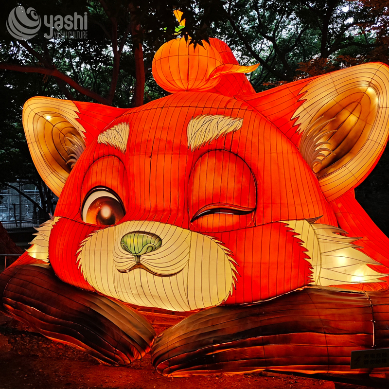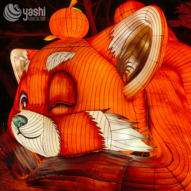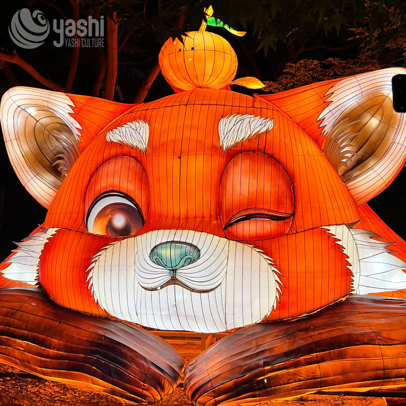 This charming red panda lantern has a winking eye, detailed orange-and-white fur, and a pumpkin top accent. Its intricate linework and LED lighting create a warm glow at night. Made from durable materials, it’s great for outdoor use.
