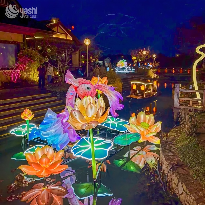 This is an exquisite koi fish-themed lantern installation, a symbol of good fortune and prosperity in Asian culture. The vivid pink-and-purple koi, with its flowing, gradient fins, is surrounded by vibrant lotus flowers and leaves, all meticulously handcrafted. When lit, it radiates a soft, enchanting glow, perfect for water features, gardens, and cultural festivals. Ideal for businesses aiming to attract customers or venues seeking to infuse an air of elegance and auspiciousness, this lantern not only serves as a stunning visual centerpiece but also tells a story of traditional artistry, making it a unique addition to any outdoor or aquatic space.