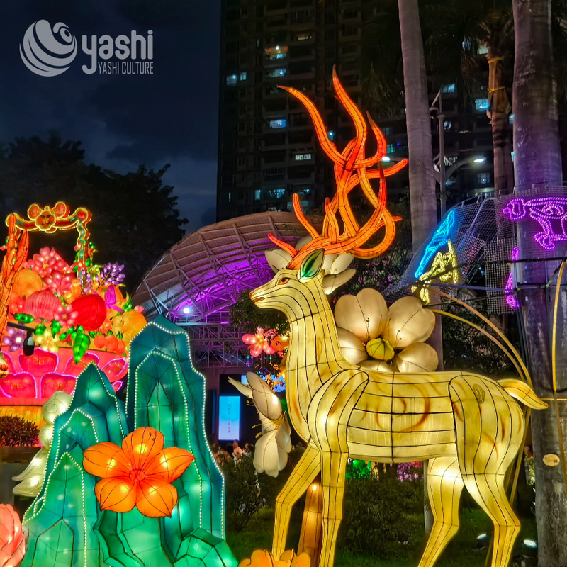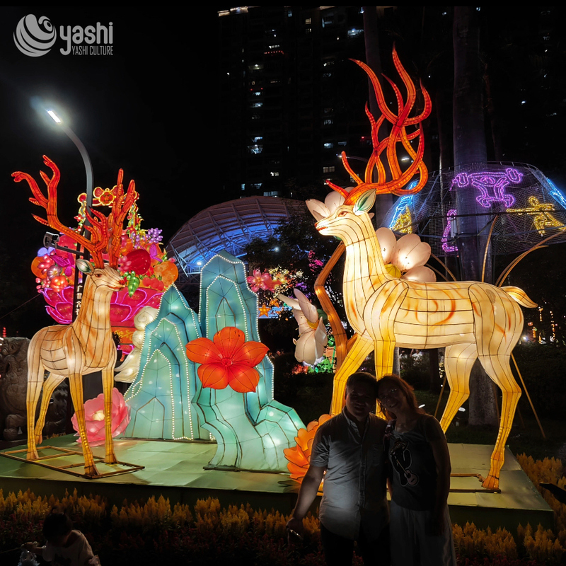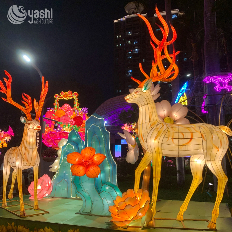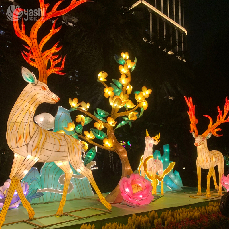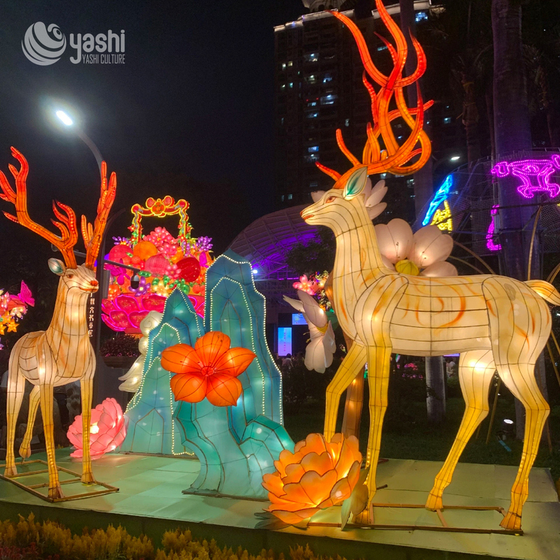 This is a set of deer-shaped lantern installations full of auspicious aura. The two deer are exquisitely shaped, with bright red antlers. Matched with the surrounding landscape and flower lanterns, they have harmonious colors and elegant artistic conception. Made with traditional handicraft techniques, they have soft and layered lighting. Suitable for festival lantern fairs, garden landscapes and other scenarios, they not only show flexible artistic beauty but also convey the beautiful meaning of "peace and safety for all", adding a strong cultural and festive atmosphere to the venue.