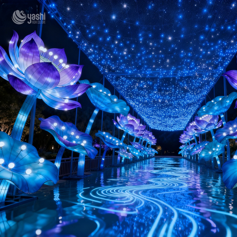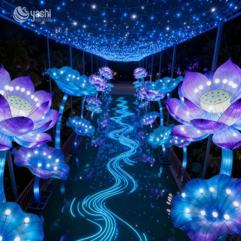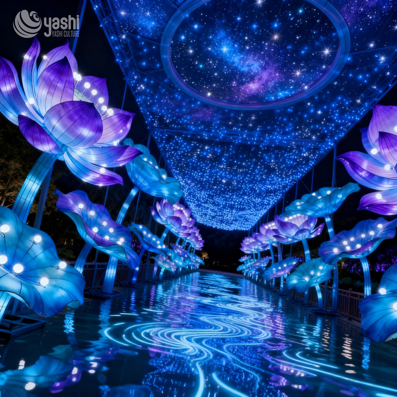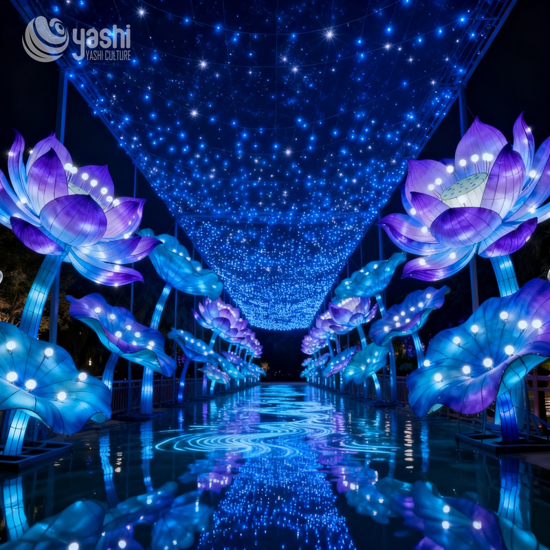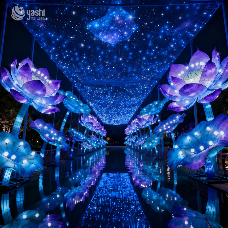 Immerse your venue in the ethereal beauty of our Giant Lotus Lantern Tunnel. Crafted with oversized, sculpted lotus blooms in gradients of deep purple and tranquil blue, each petal is tailored from premium satin fabric—ensuring vivid color saturation and soft, glowing light transmission. The metal arch structure and internal LED wiring guarantee durability while delivering a dreamy luminescence, complemented by a starry LED ceiling and water-reflection design for multi-dimensional visual appeal.