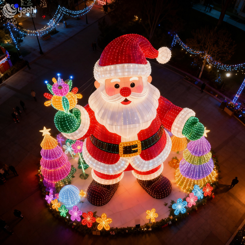 Introducing this Giant Santa Claus Lantern, a showstopper for your Christmas decor! Meticulously crafted with vibrant LED lights, it features a cheerful Santa holding a colorful ornament, surrounded by luminous Christmas trees and floral accents. Perfect for outdoor spaces like shopping malls, theme parks, holiday events, and residential areas, it creates a magical, festive atmosphere that attracts visitors and elevates holiday spirit. Built with durable materials to withstand outdoor conditions, this lantern ensures a dazzling display throughout the Christmas season. It’s an ideal choice for commercial decorations, Christmas celebrations, and creating unforgettable holiday memories.