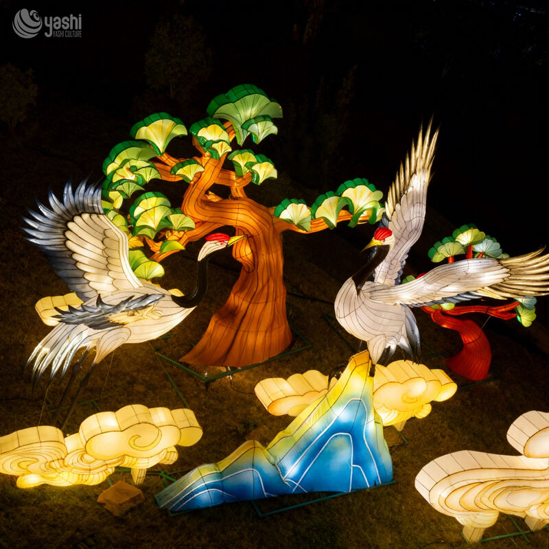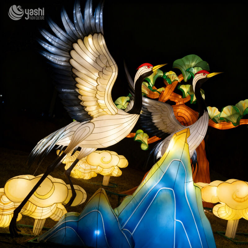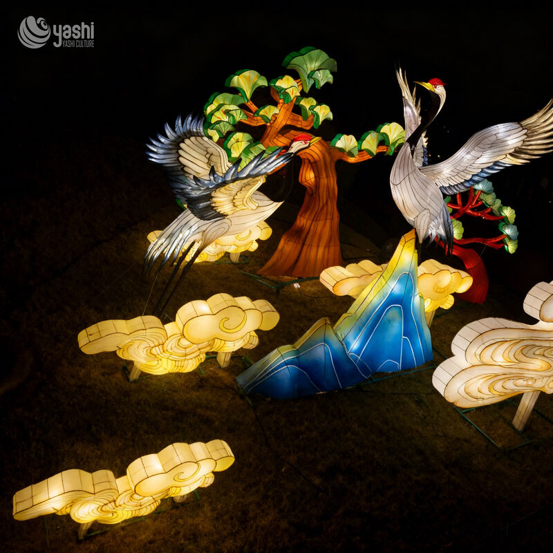 This giant art lantern set themed around "pine and crane" (a traditional Chinese symbol of longevity) centers on classic auspicious imagery: two cranes feature dynamic, outstretched wings with exquisitely detailed feather textures—their red crests, white bodies, and gradient blue wingtips exude an ethereal charm. Beside them, a sturdy pine tree is paired with cloud and mountain lanterns, weaving the symbolic meaning of "longevity" into every design detail, while carrying the elegant ambiance of Oriental aesthetics.