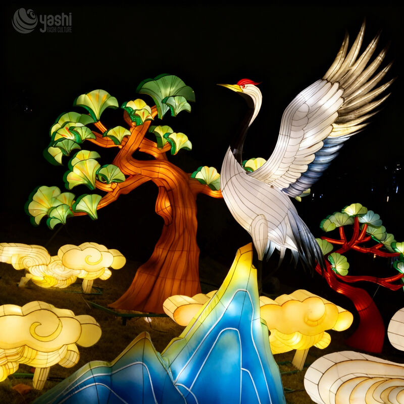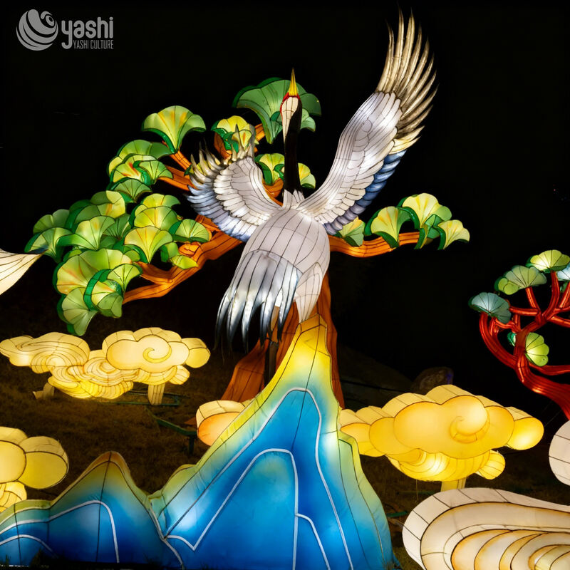 Crafted from high-transparency soft-light materials with layered lighting design: when lit at night, the crane feathers, pine branches, and cloud outlines emit a soft, layered glow. Interwoven hues of blue, yellow, and brown create a dreamy nighttime effect. Its giant size (suitable for outdoor venues) makes it an instant visual focal point—preserving the cultural charm of traditional elements while enhancing scene appeal through modern lighting technology.