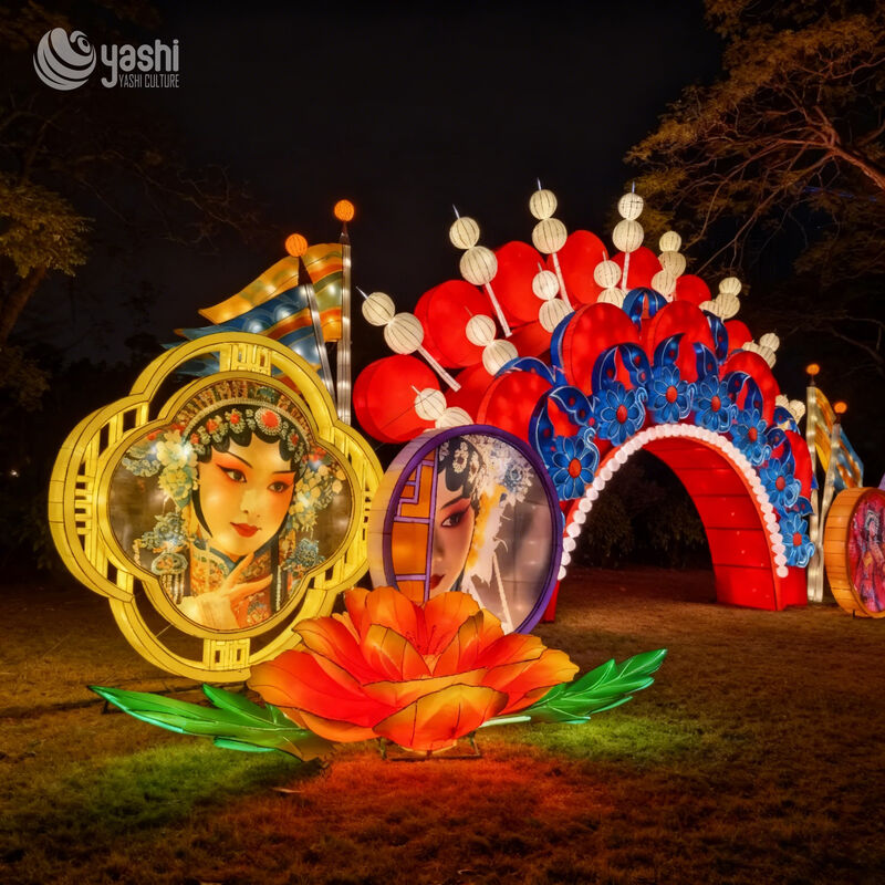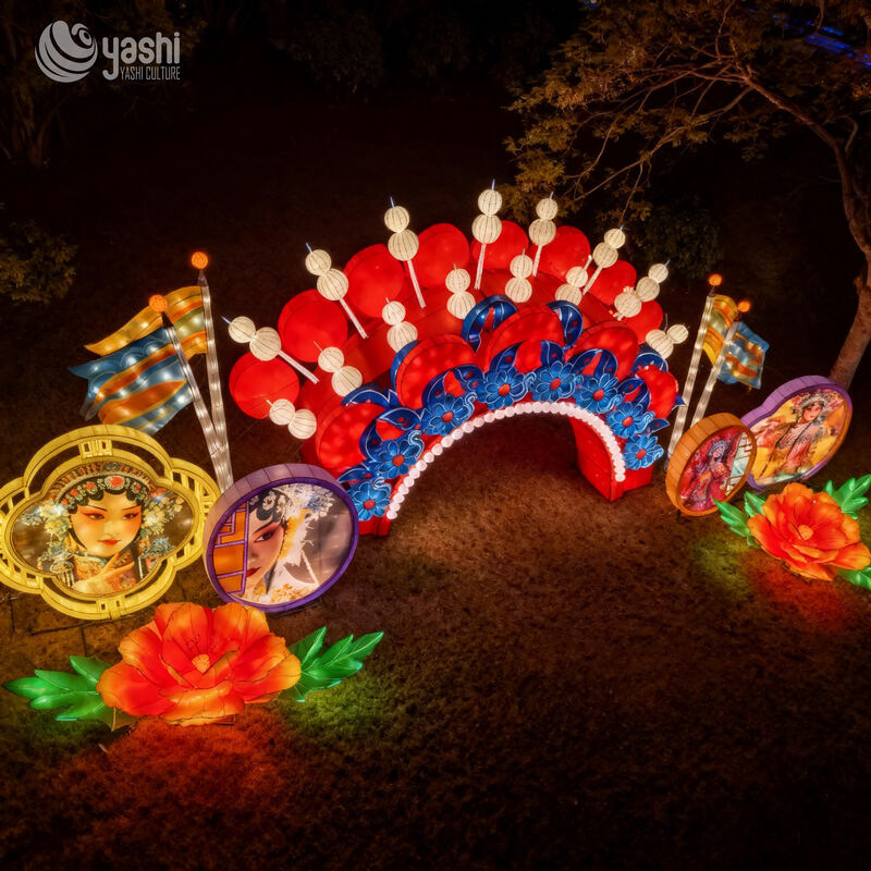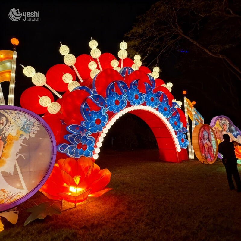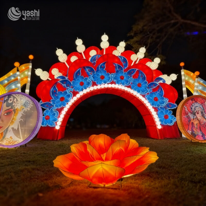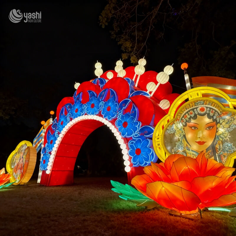 This Guochao-style opera-themed lantern arch centers on traditional Chinese opera attire: the arch’s main body uses classic opera color pairing (bright red + royal blue), decorated with carved patterns and spherical lanterns to replicate the exquisite texture of opera costumes. Opera facial makeup lantern paintings on both sides skillfully blend opera culture with lantern art, exuding a strong Chinese-style vibe.