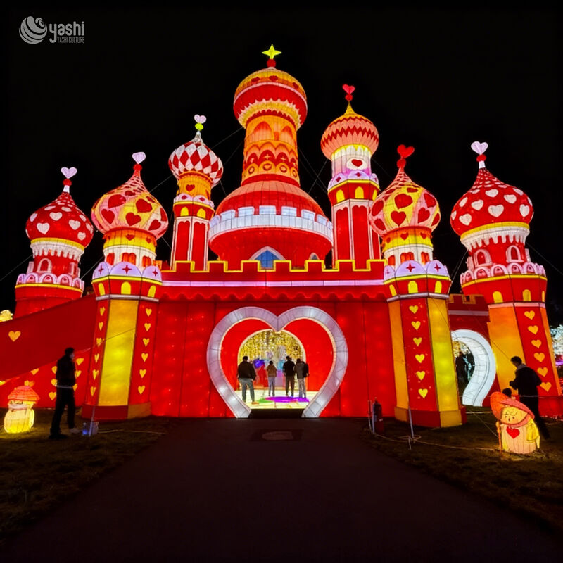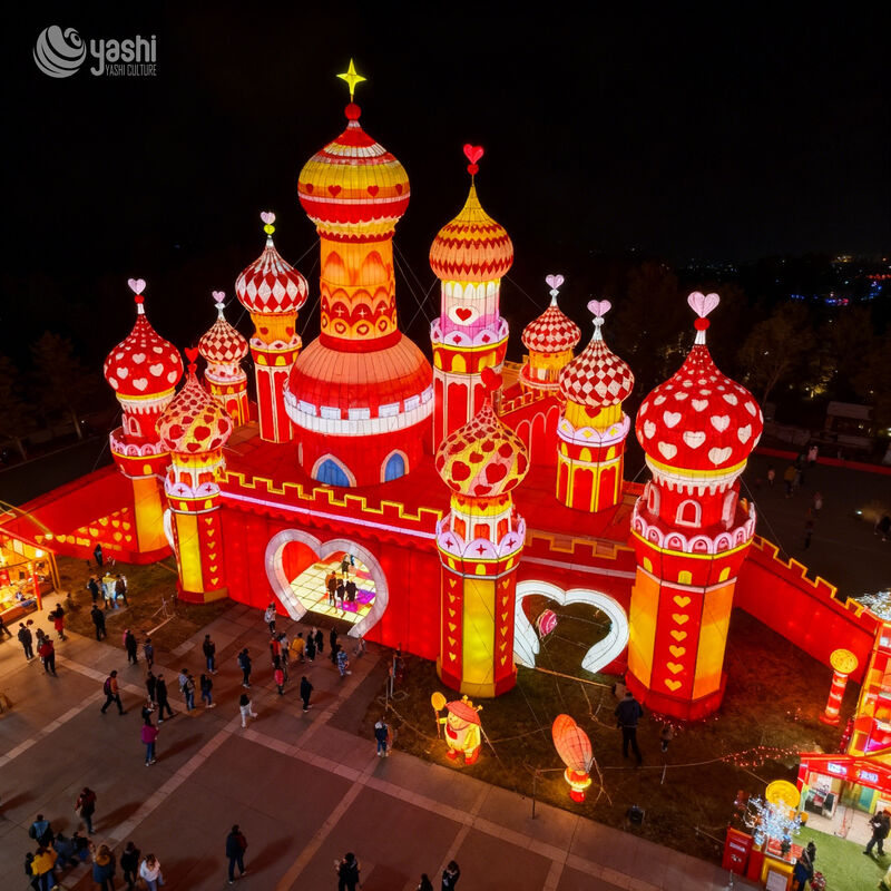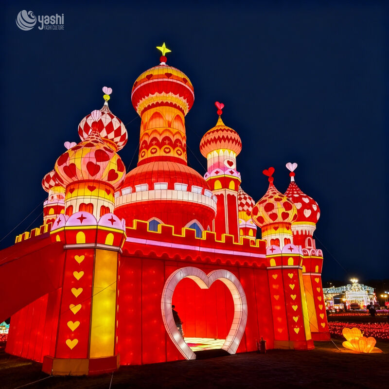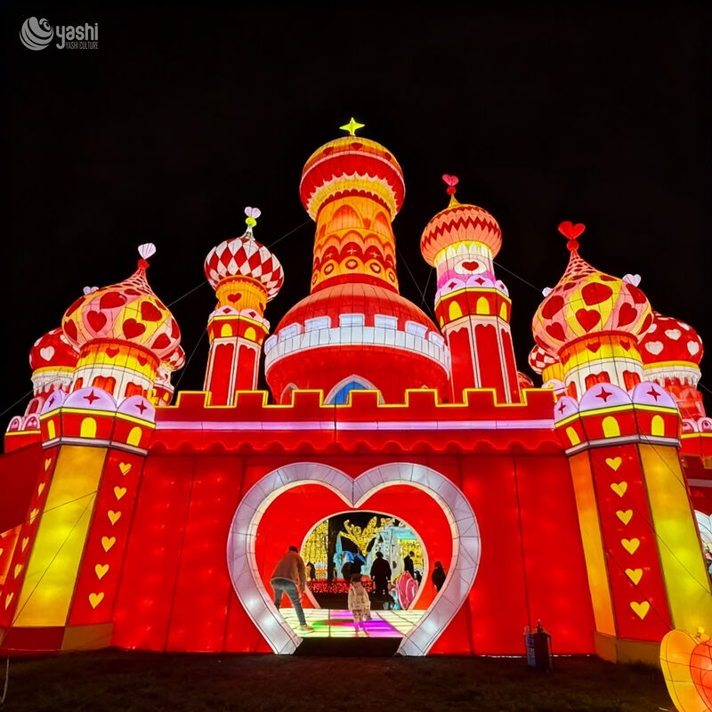 Decor Accents: All domes and towers are adorned with heart patterns (cutouts, printed motifs) and a central heart-shaped entrance—turning the installation into a romantic, photo-ready focal point.