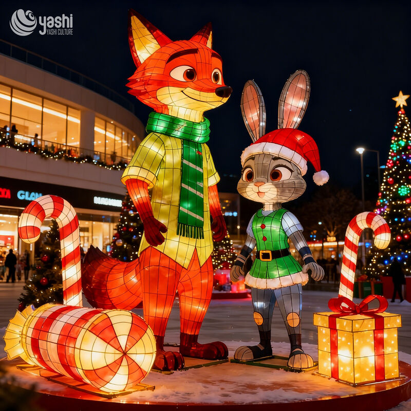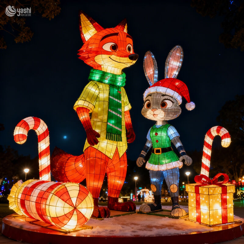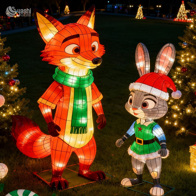 Crafted with Zigong’s intangible heritage lantern-making techniques, this set features vivid, festive versions of Nick and Judy, accented with holiday details like Santa hats. Made from waterproof, flame-retardant fabric and supported by a rust-proof metal frame, it ensures durable outdoor use.
