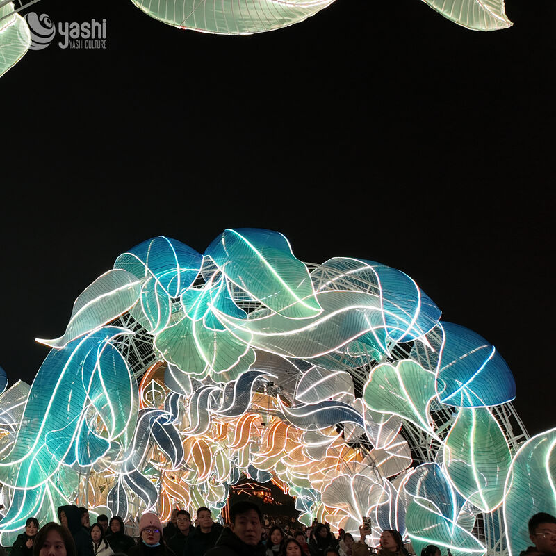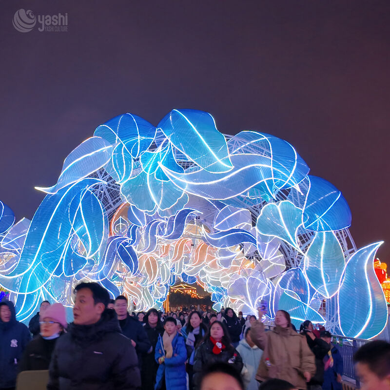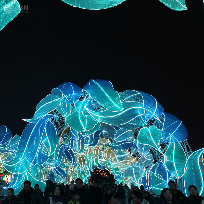 This wave-shaped lantern tunnel is crafted with authentic Zigong intangible cultural heritage techniques. Made from high-transparency silk fabric and paired with LED cold light sources, it features a translucent blue-green gradient glow, with smooth lines creating an immersive light-shuttle experience.